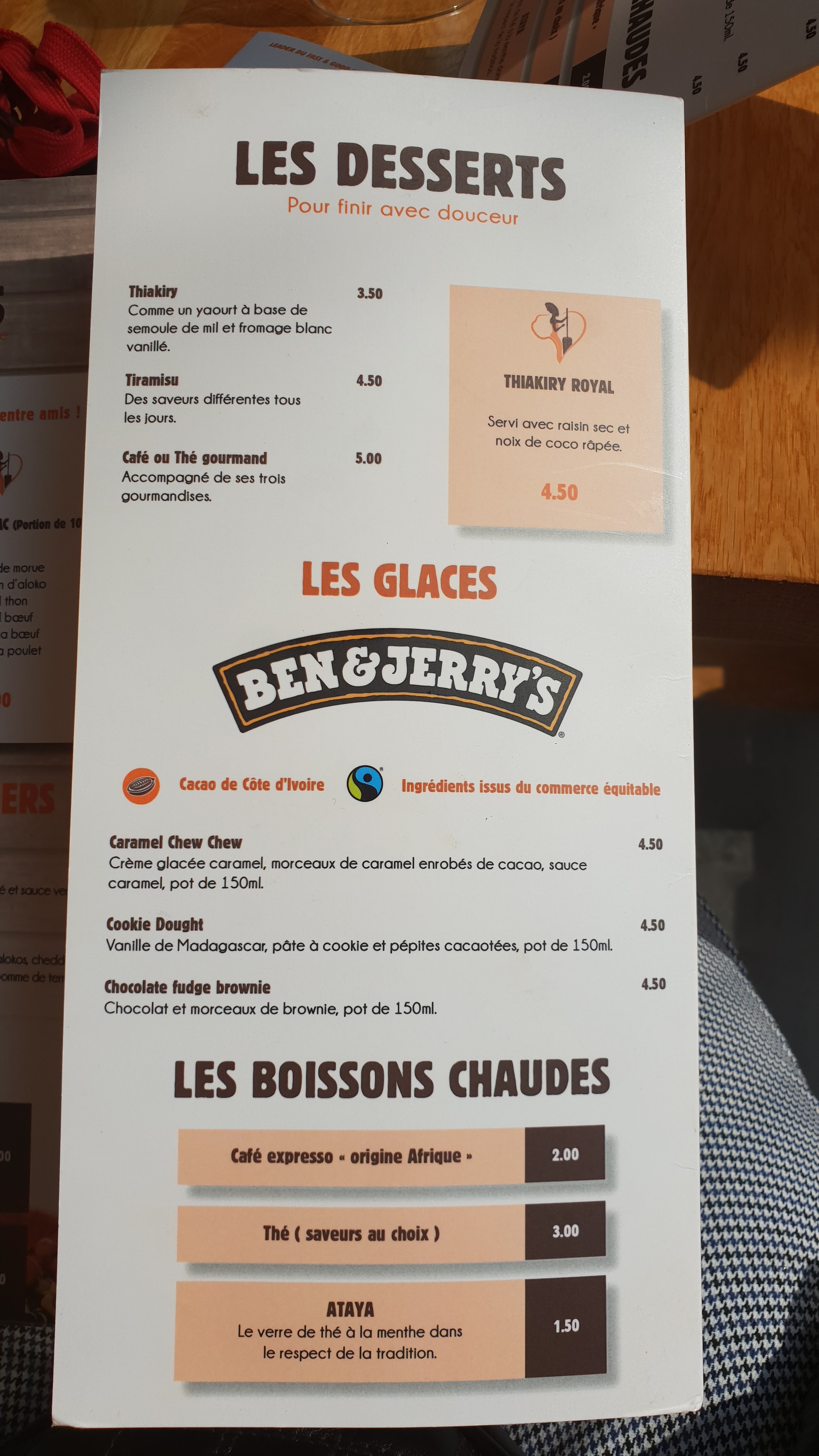 Posté le 15/02/2024 à 20:47"Nous avons testé : - le tieb poulet : le poulet était bon, le riz médiocre très pâteux . Mention spéciale pour la sauce verte très bonne , la sauce rouge par contre, vraiment pas à notre goût . - Dibi côtelettes d’agneau à 19e ⚠️ Sachez qu’il n’y a que 3 côtelettes . Je pense qu’il serait judicieux de le précisiez pour éviter les déceptions, c’était bon mais je ne recommanderais pas . - Dégué : plutôt bon, les boules de mil ne sont pas sec contrairement à ce que l’on trouve souvent dans les restaurants, peut être un peu de vanille pour aromatisé serait top ."