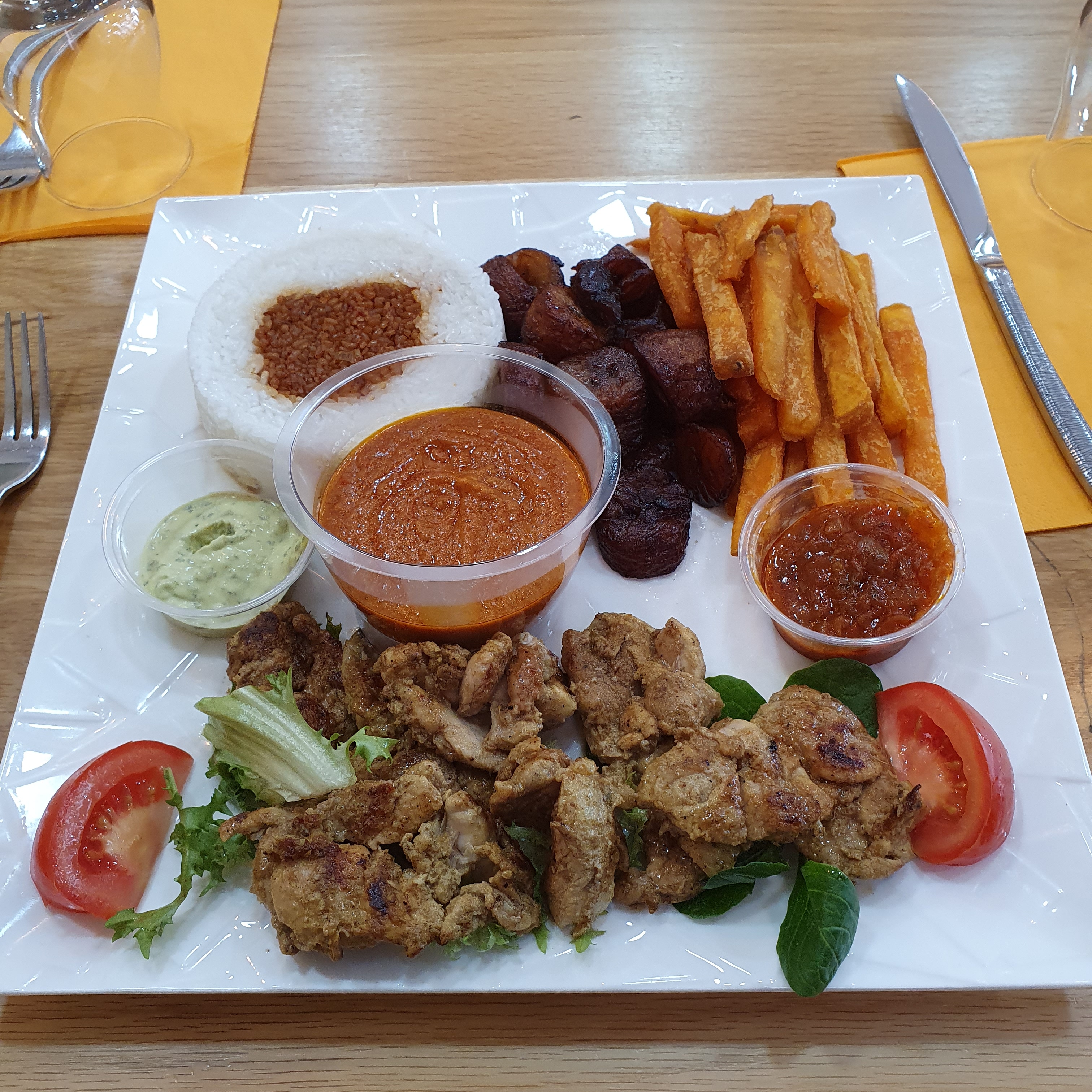 Posté le 29/02/2020 à 22:38"Déçue !! Ce n'est pas mauvais, ce n'est pas non plus le meilleur africain que j'ai mangé. L'aloko quand a lui n'est pas génial. Les frites, le riz et les sauces sont bons. Mais ce qui m'a le plus déçu c'est le service. J'ai demandé à la serveuse si dans ce plat c'était du blanc de poulet ou de le cuisse désossée (en précisant que je n'aime la cuisse de poulet) et elle m'a assuré que c'était du blanc, et au final ce n'est pas du blanc mais bien de la cuisse désossée"