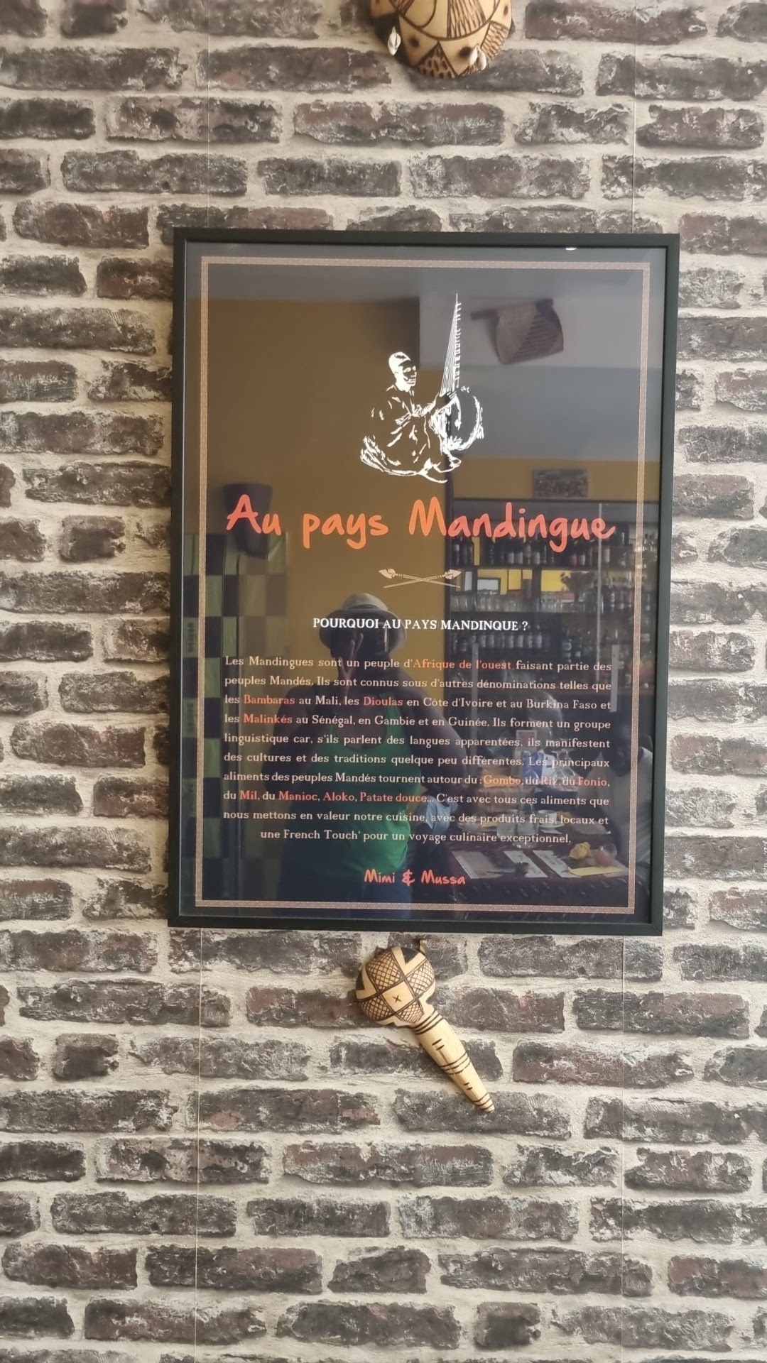 Posté le 20/12/2017 à 11:42"Nous avons passé un très bon moment ... j’ai adoré la déco avec les instruments de musique et les nappes en wax ainsi que les petites lumières tamisées ! nous avons très bien mangé , belle soirée passée au pays mandingue ♥️!"
