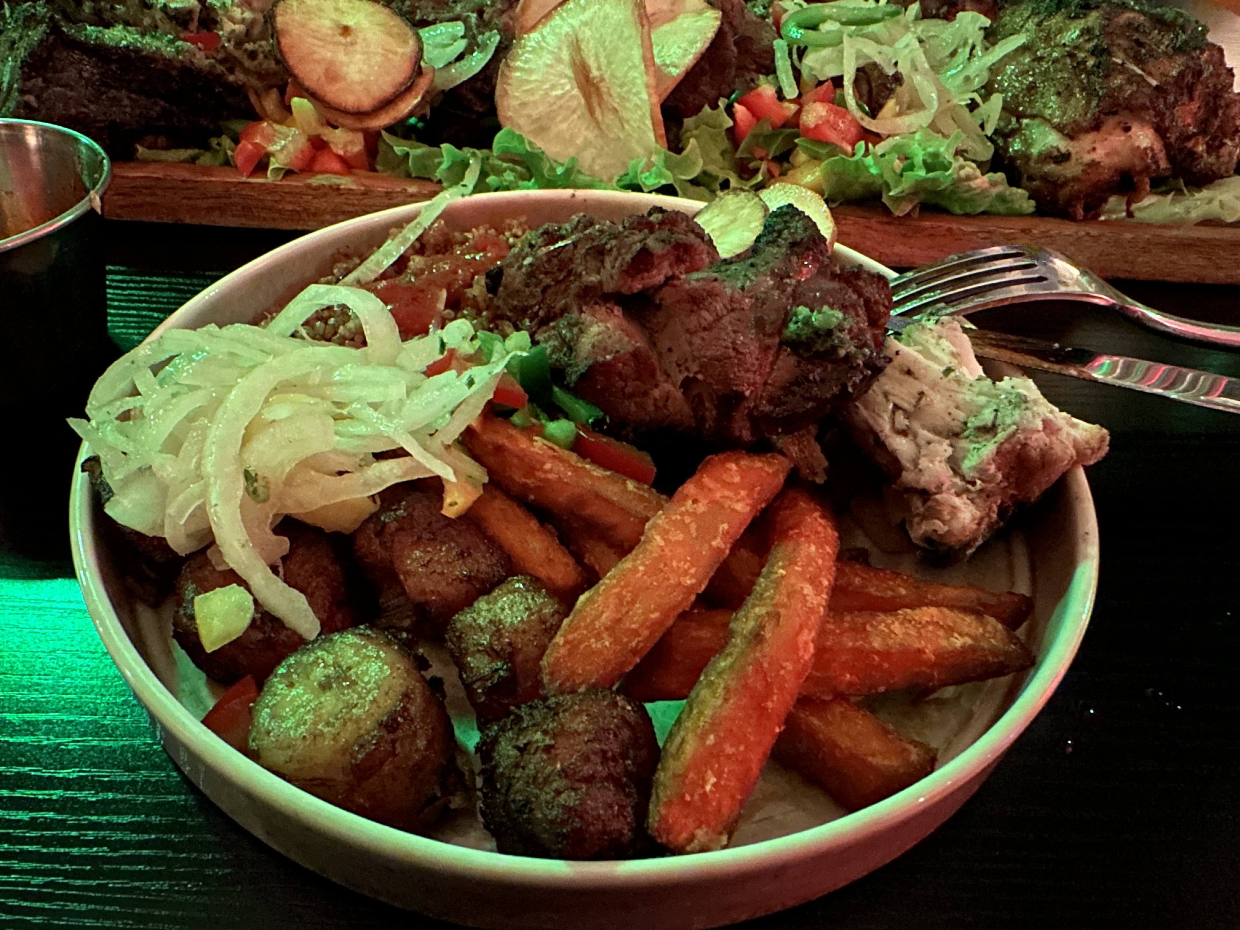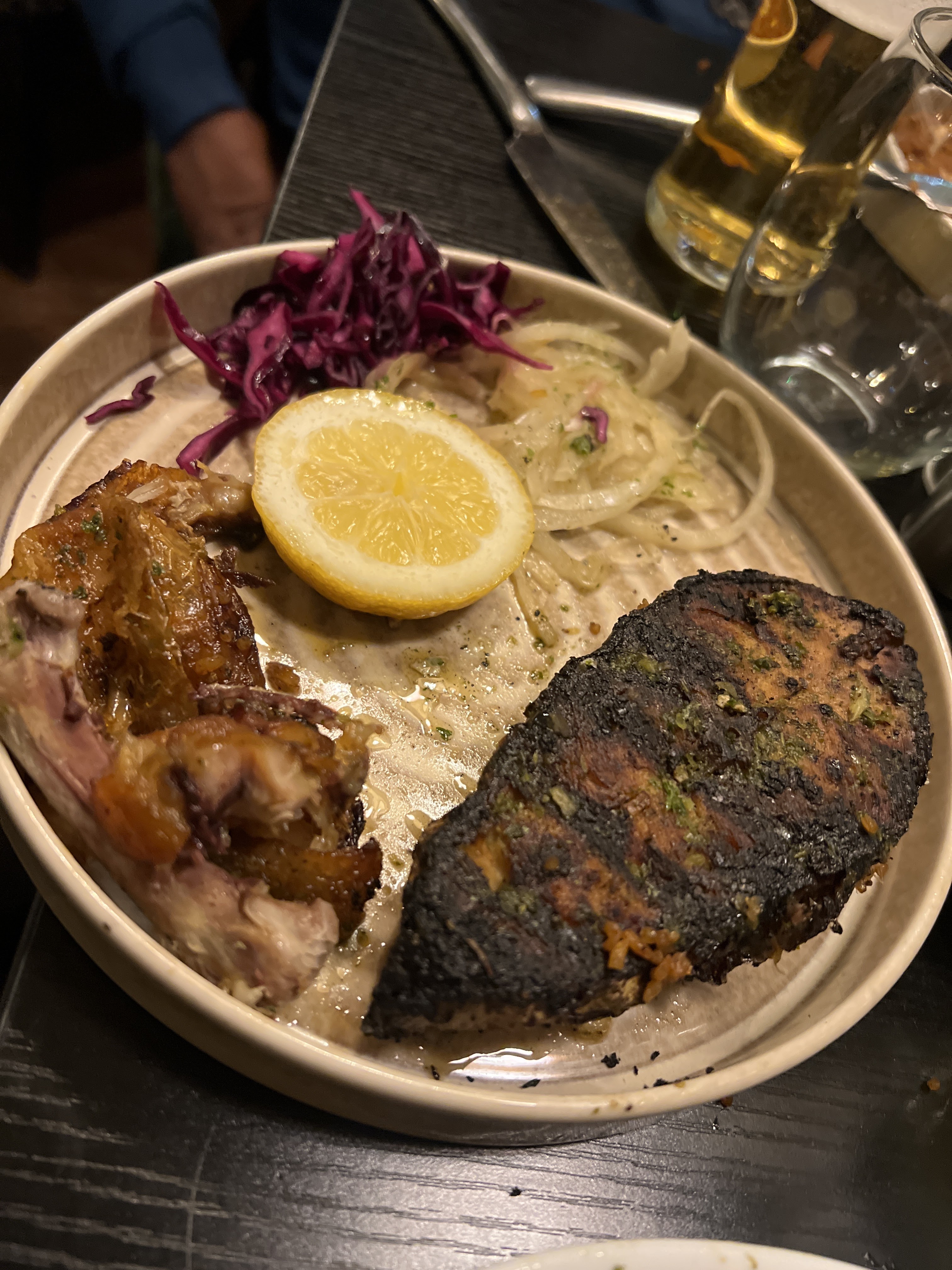 "Pas à la hauteur de mes espérances... L'accueil du portier aux serveurs était top. Beau cadre et petit live sympa. Cependant les plats ont un prix très élevé par rapport à ce que j'attendais retrouver dans l'assiette. Plats trop copieux. Entrée à partager très redondant avec certains plats (bananes plantain, crudités). Cuisson du poulet parfois sec ou pas assez cuit dont le côté braisé manquait au goût. Je m'attendais à plus de revisite et de fun dans l'assiette. Ces 2 étoiles pour le service et l'ambiance. :)"