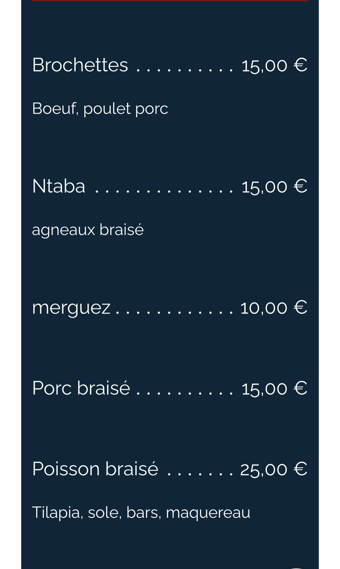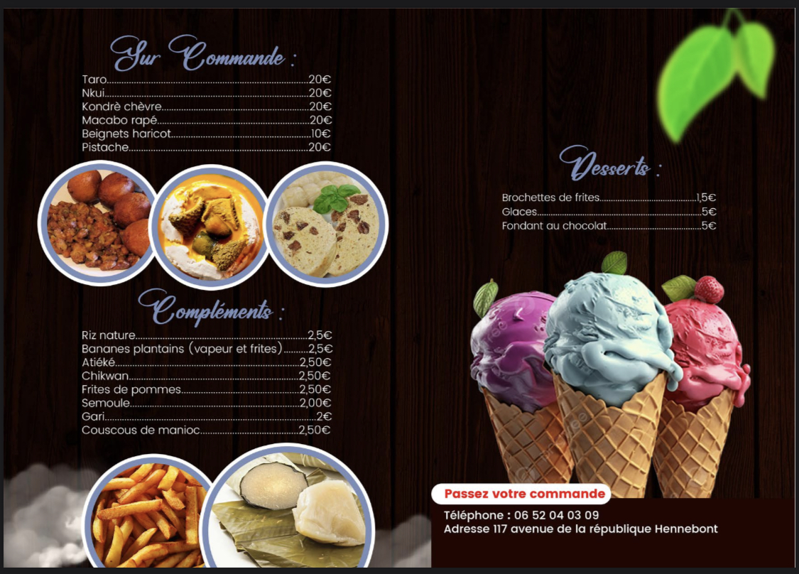 Posté le 18/09/2024 à 20:45"Les viandes, le poisson, l’atieké, tout étaient très bon, bien assaisonné, le plat qu’on nous a servi était coloré, c’était bien présenté ! Merci à eux pour le service et l’accueil chaleureux, content de connaître cette nouvelle adresse ! Je recommande 👍"